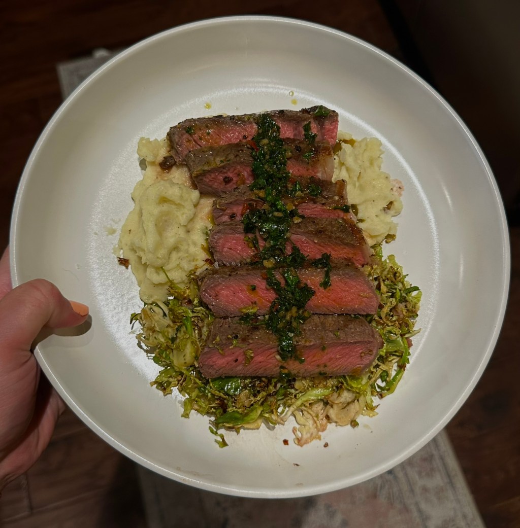 My perfect steak dinner features a ribeye with chimichurri sauce, roasted garlic mashed potatoes, and roasted shaved brussels sprouts.