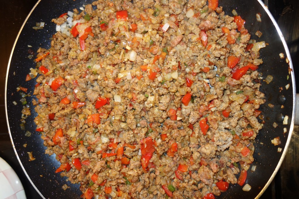 Next, prepare the taco meat. In a large skillet over medium-high heat, cook the ground beef until it begins to brown. Add in the onion, garlic, jalapeños, and bell pepper, and sauté until the vegetables are softened. Stir in the cherry tomatoes and taco seasoning to taste, adding a splash of water or broth if needed to help everything come together. Let the mixture simmer for a few minutes until it’s rich and flavorful.
