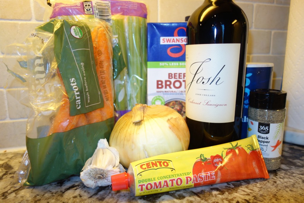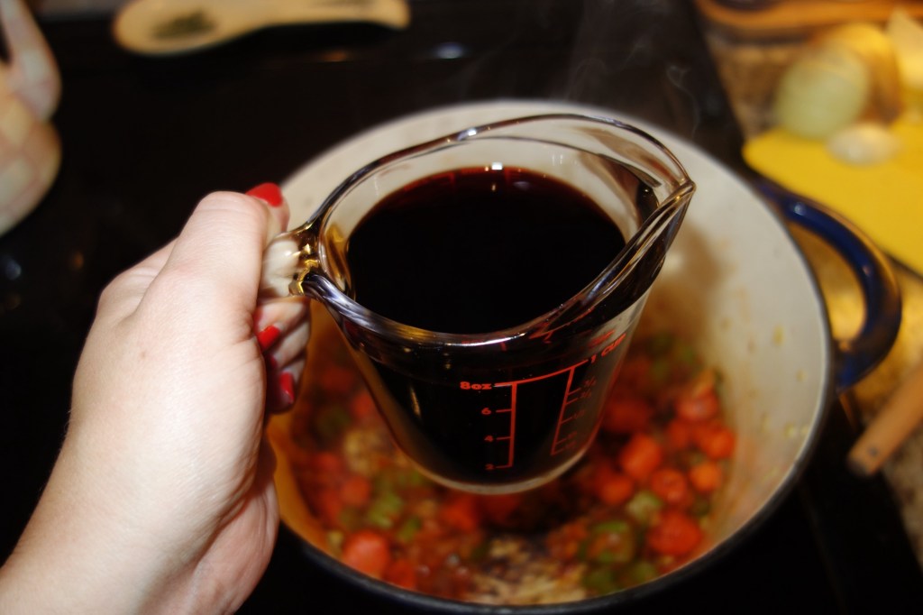 - You can use any dry red wine that you prefer – I used a Cabernet Sauvignon. I remember learning growing up though, that you shouldn’t cook with a bottle of wine you wouldn’t drink!