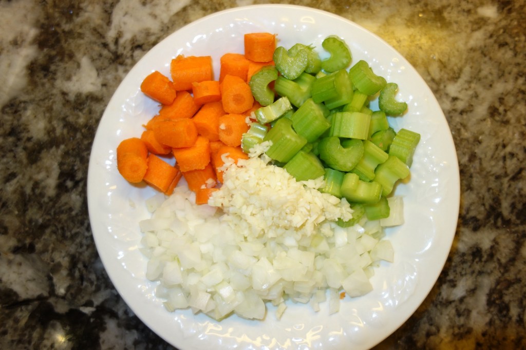 Preheat your oven to 325°F. Start by prepping the vegetables – dice the onion, mince the garlic cloves, and roughly chop the carrots and celery. Set them aside while you heat a large Dutch oven over medium-high heat.