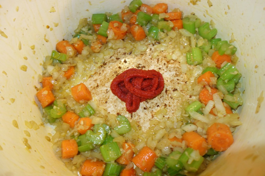 In the same pot, add the onion, garlic, carrot, and celery. Sauté for 5–7 minutes, until the vegetables begin to soften and the onions become translucent. Add the tomato paste and stir it into the vegetables. Let it cook down for another 2–3 minutes. You want to cook the tomato paste and start to caramelize it to help reduce the acidity and bring out the natural sweetness.