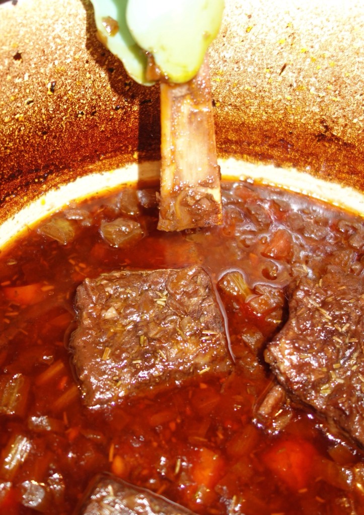 When the short ribs are done, carefully remove them from the Dutch oven and set aside. The bone should fall right off!