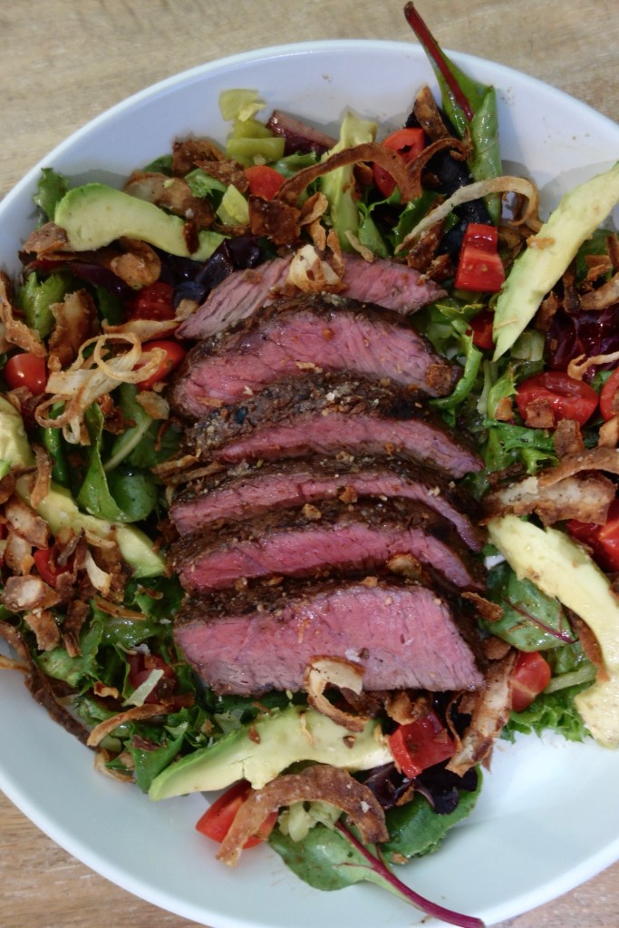 I’ve recently become a salad lover, and one of my new favorite weeknight dinners is a hearty salad. This steak salad is super quick to make and both filling and nutritious. The best part of this salad is that it is flexible! You can throw in whatever else you have on hand, and whether it’s some roasted veggies, crumbled feta, or a handful of nuts, you really can’t go wrong with this one. I kept my salad simple and topped it with cherry tomatoes, pepperoncinis, fried onions, and avocado.