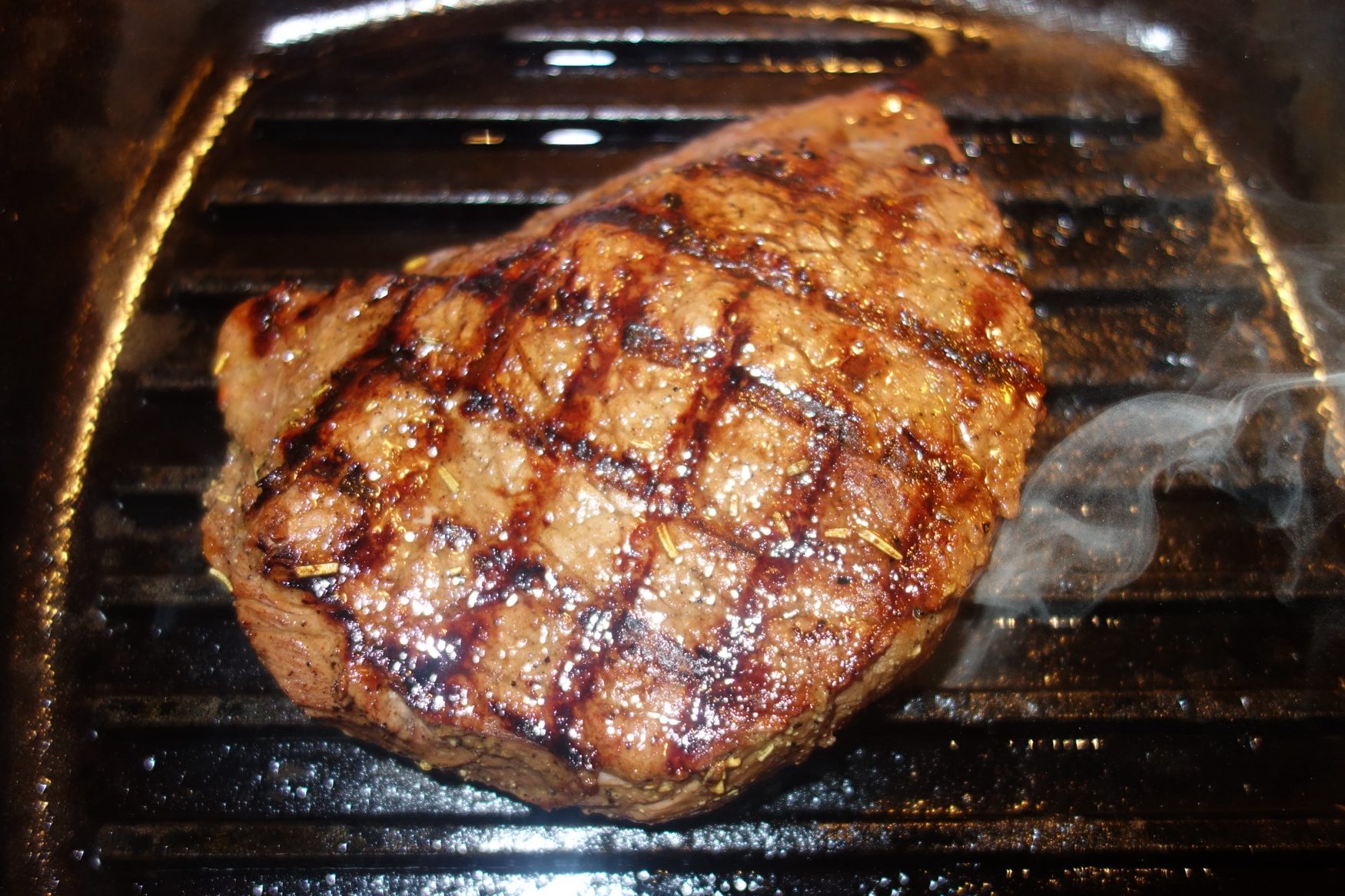 Cook your steak until the internal temperature reaches 125°F, 2-4 minutes per side depending on thickness, for medium rare. If using a grill pan, rotate your steak 90° midway through on each side to get good grill marks.