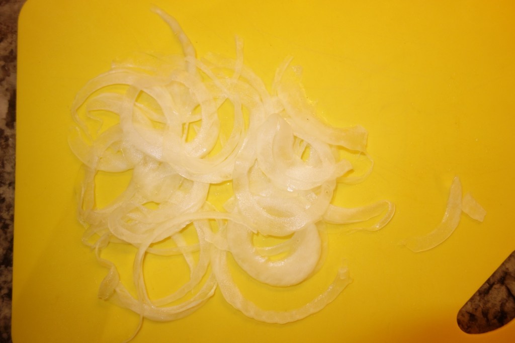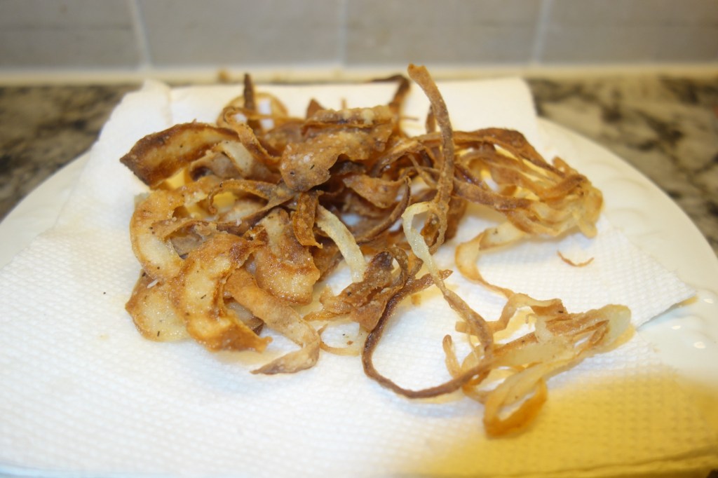 Next, if you are making your own fried onions, thinly slice the onion using a mandoline. Preheat a shallow pan with a hight heat oil and toss the onions in the seasoned flour mixture. Shake off any excess flour and fry in the oil util golden brown. Transfer to a paper towel-lined plate and lightly salt while still hot.