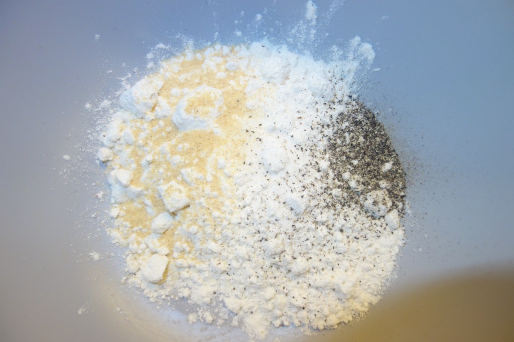 - 4 tbsp flour, seasoned with salt, pepper, and garlic powder