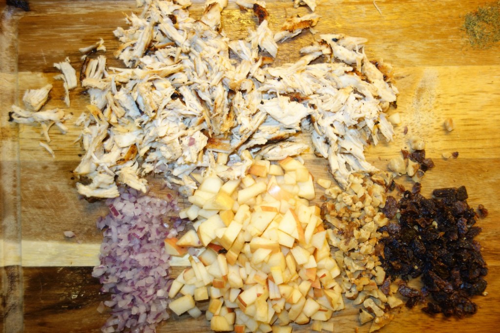 Let it cool completely, then dice or shred it into bite-sized pieces. While the chicken is cooking, dice the apple, and red onion. Roughly chop the walnuts. In a medium bowl, whisk together the Greek yogurt, mayonnaise, lemon juice, paprika, garlic powder, dill, salt, and pepper until smooth and creamy. In a mixing bowl, combine the chicken, apple, red onion, walnuts, and raisins. Pour the dressing over the top and gently toss until everything is evenly coated. Cover and refrigerate for at least 30 minutes to let the flavors blend. Serve it over mixed greens, in a wrap, or on its own.